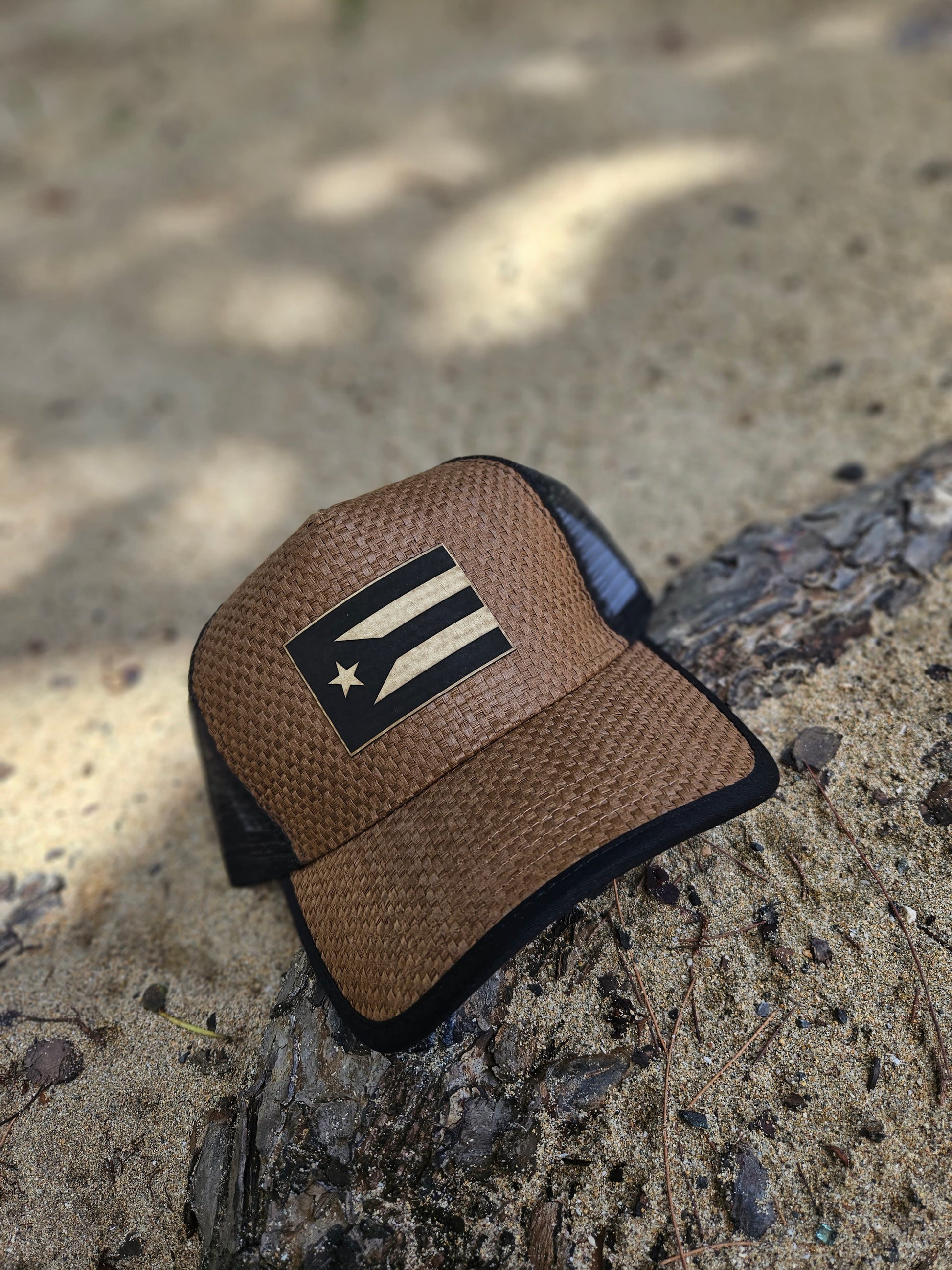 Gorra de paja marrón con malla trasera color negra. Ajustable. Abierta.