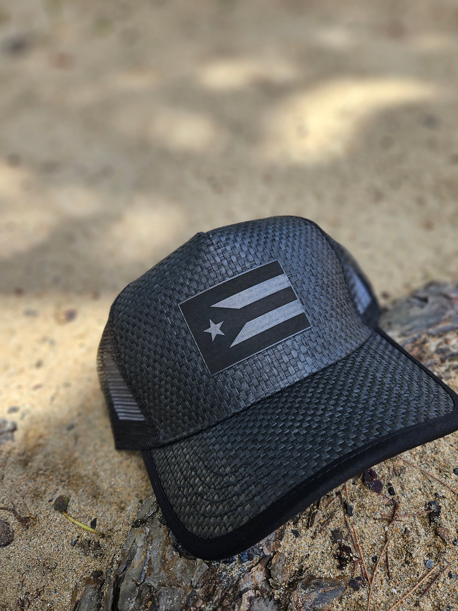 Gorra de paja negra con malla trasera color negra. Ajustable. Abierta.