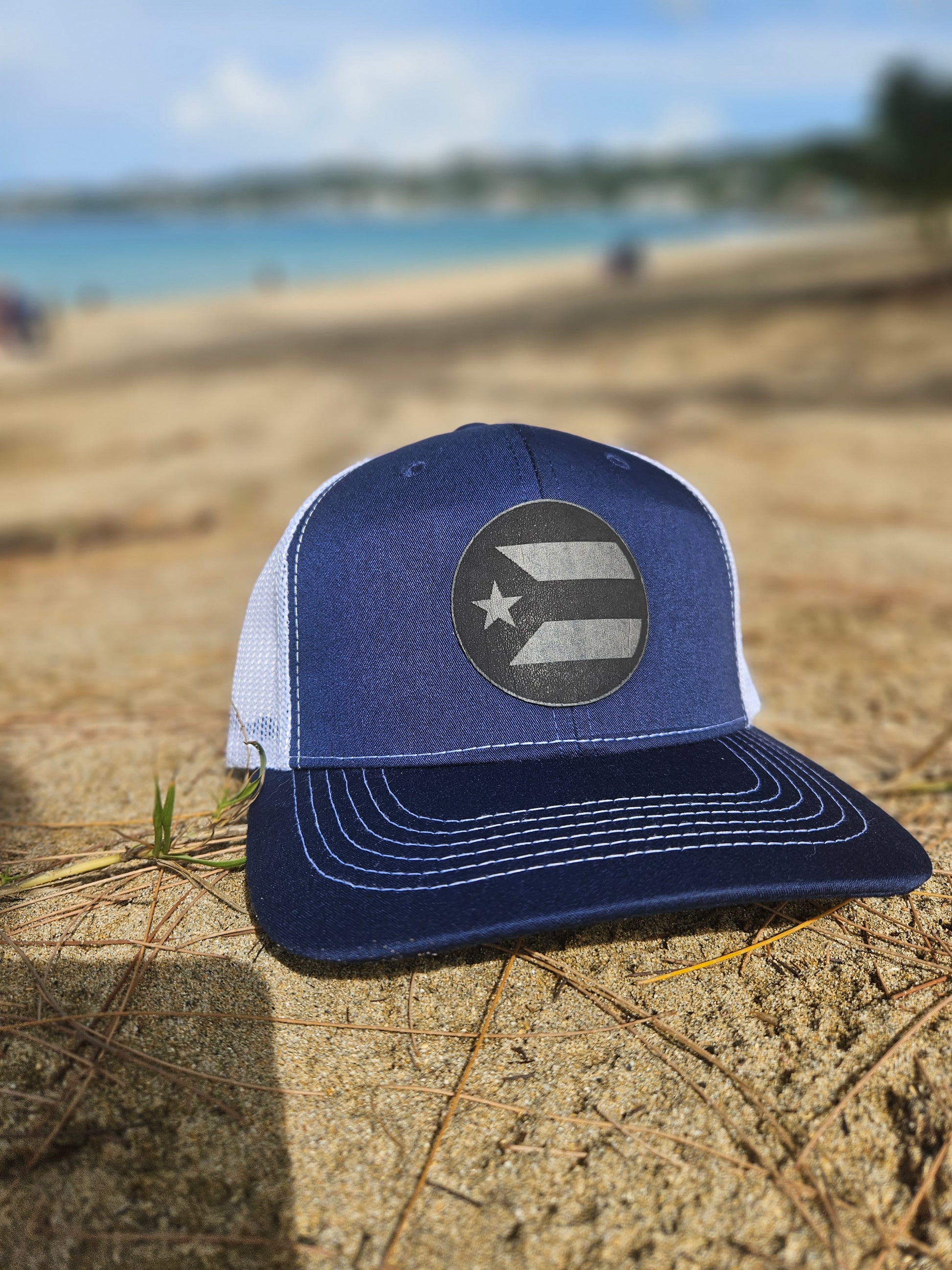 Gorra de tela azul con malla trasera blanca. Ajustable. Abierta.
