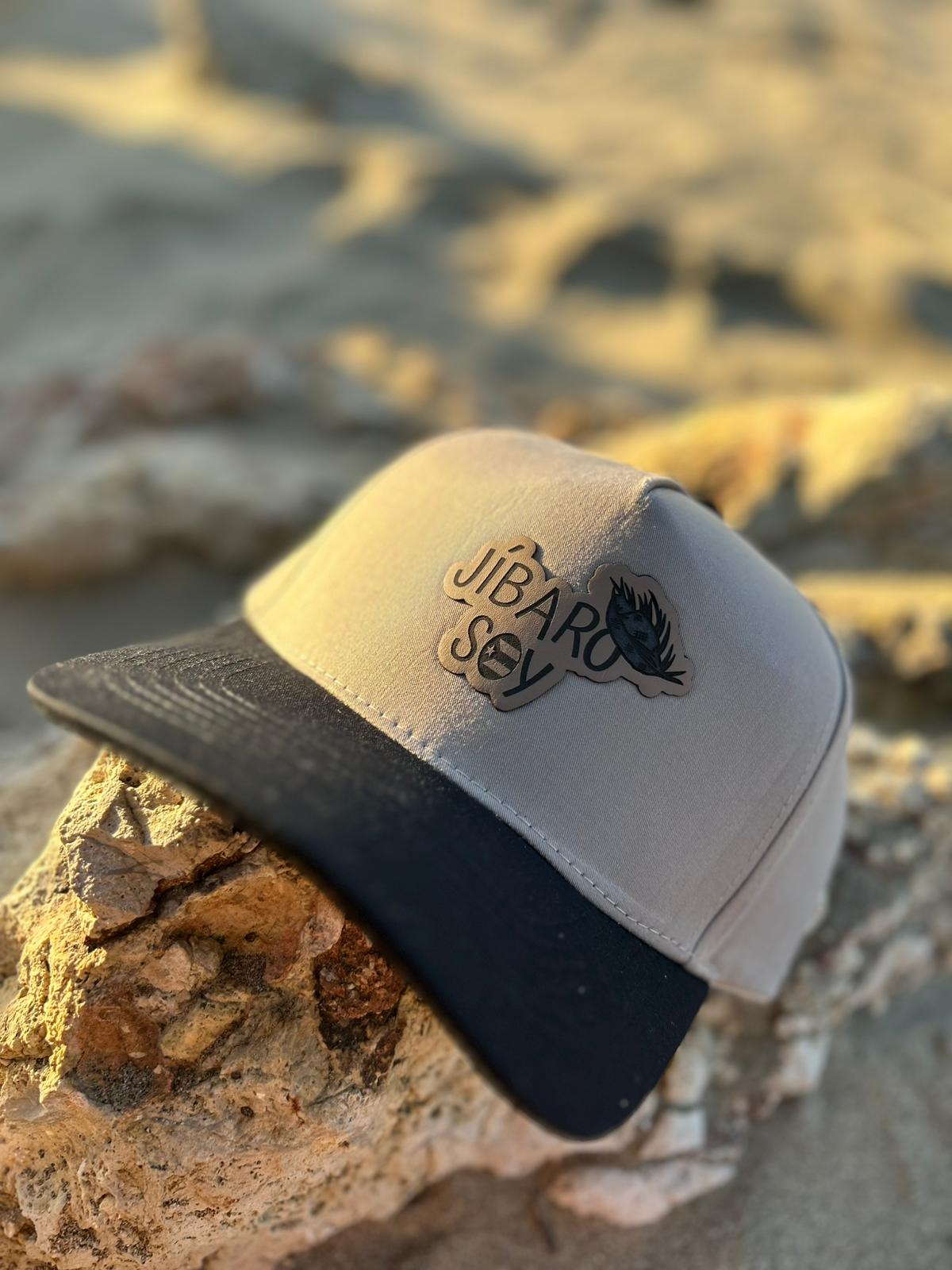 Gorra de tela crema oscura con visera negra. Ajustable. Abierta. High top.Â