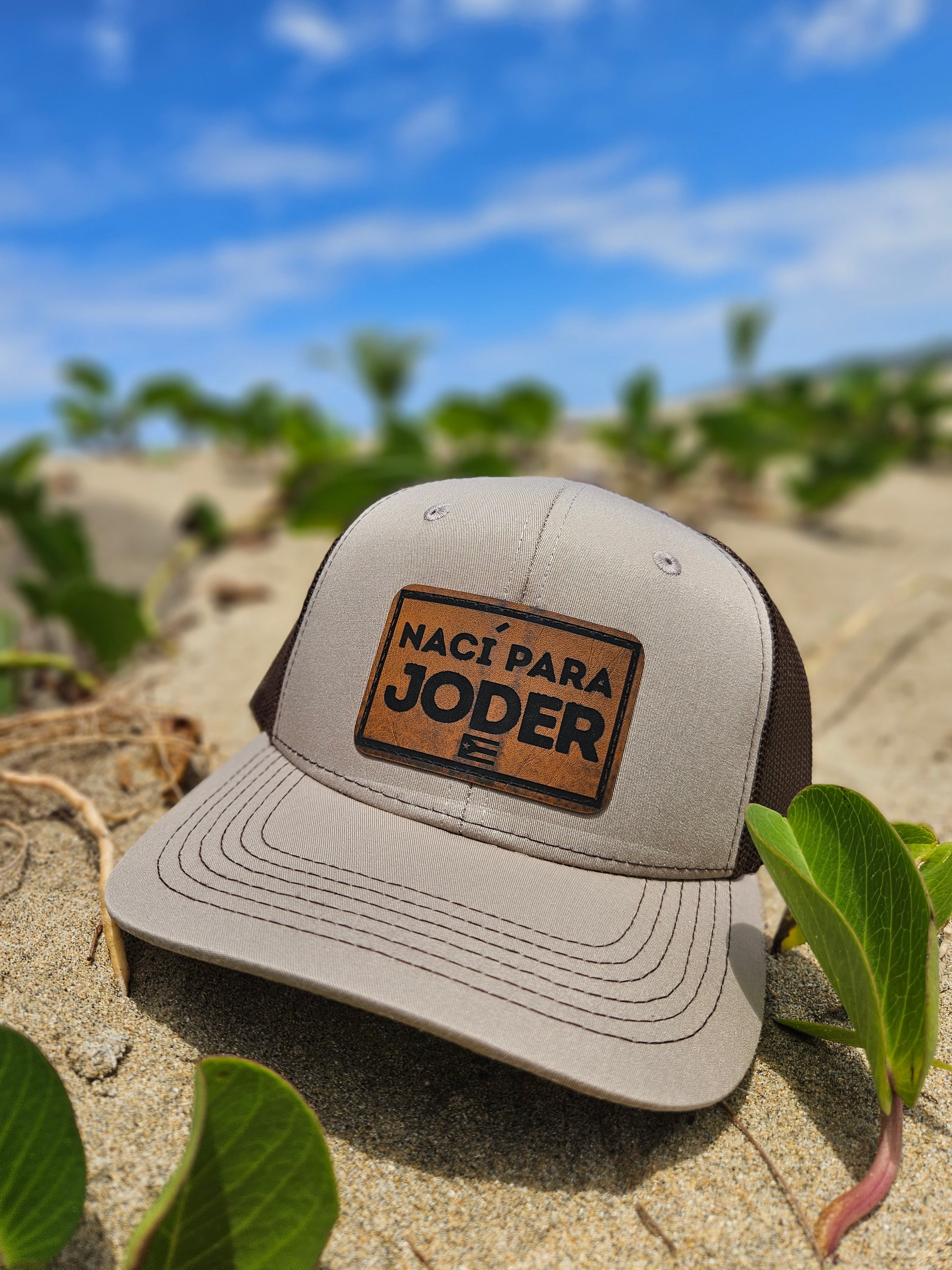 Gorra de tela crema con malla marrón. Ajustable. Abierta.
