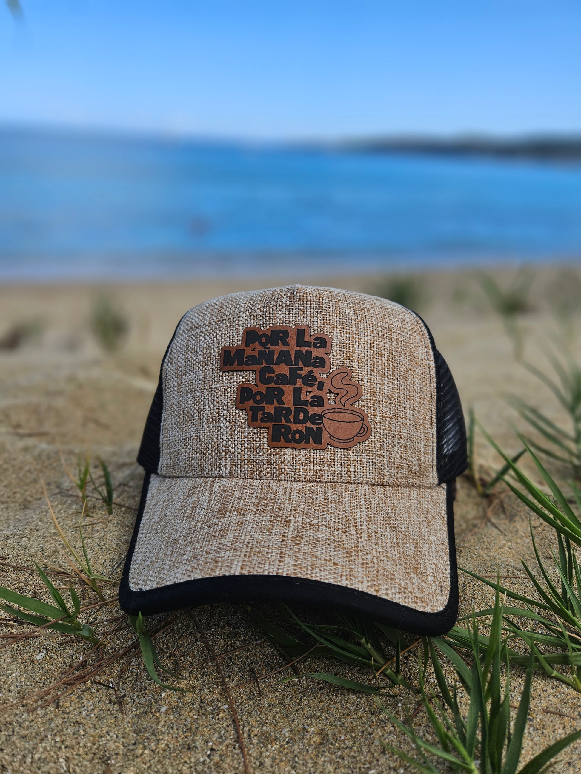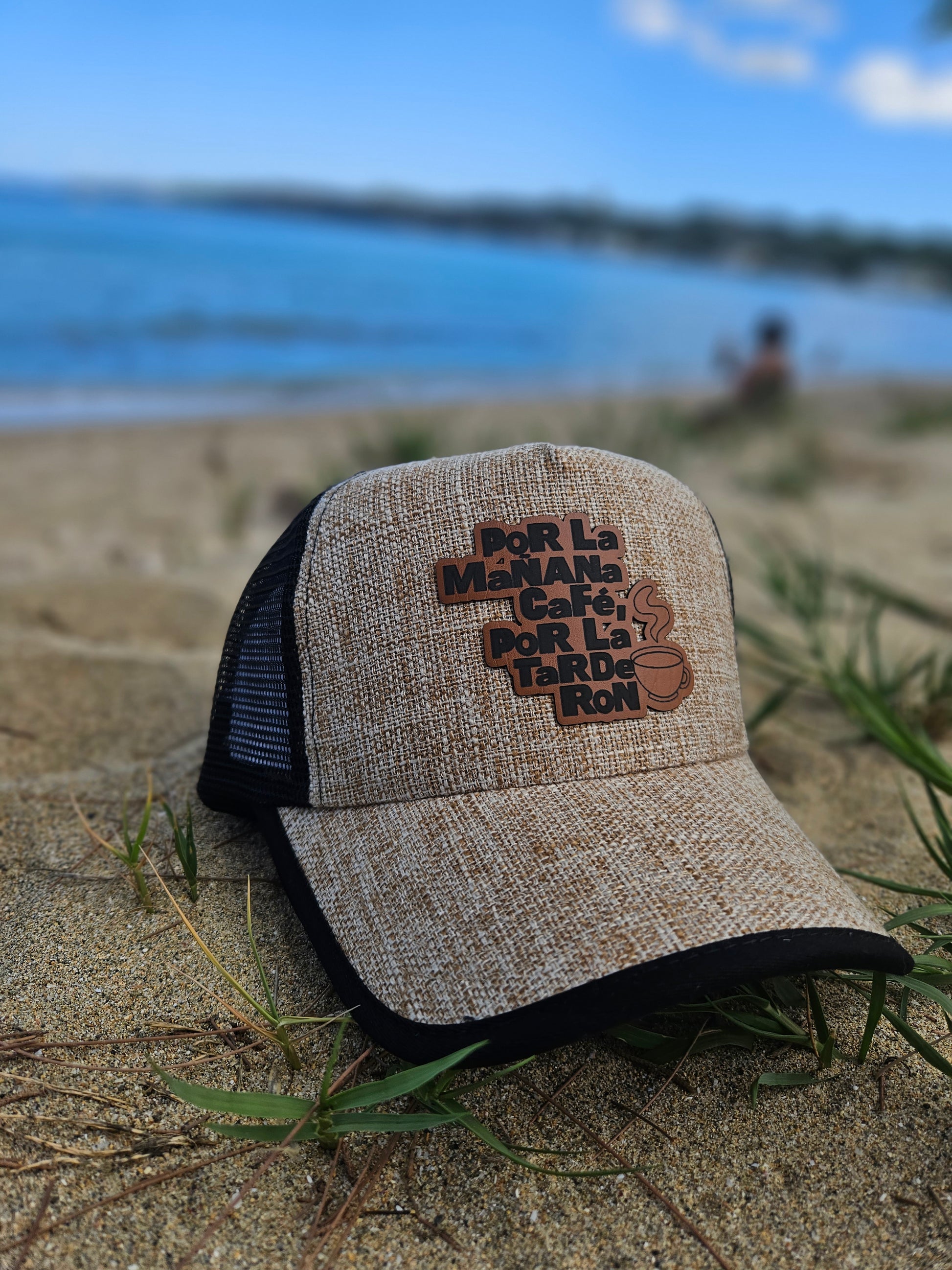 Gorra en tela simulando paja color crema con malla trasera negra. Ajustable. Abierta. High top.