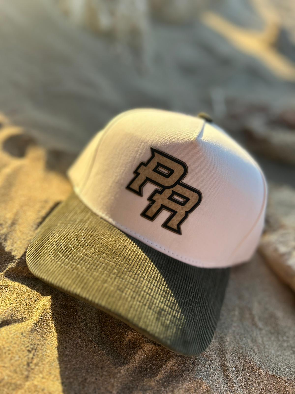 Gorra de tela crema clara con visera verde aceituna corduroy. Ajustable. Abierta. High top.