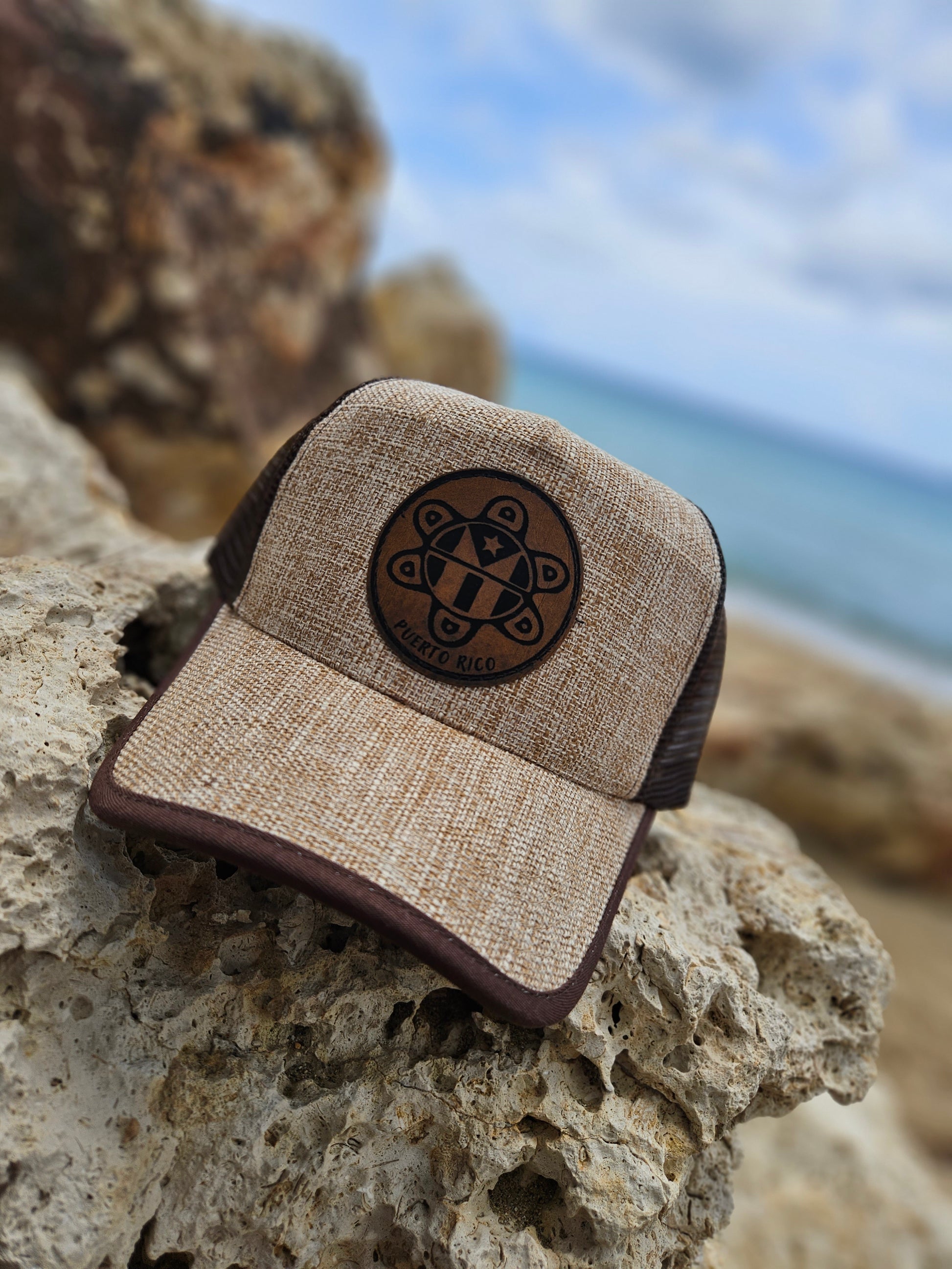 Gorra de tela crema simulando paja con malla trasera color marrón. Ajustable. Abierta.