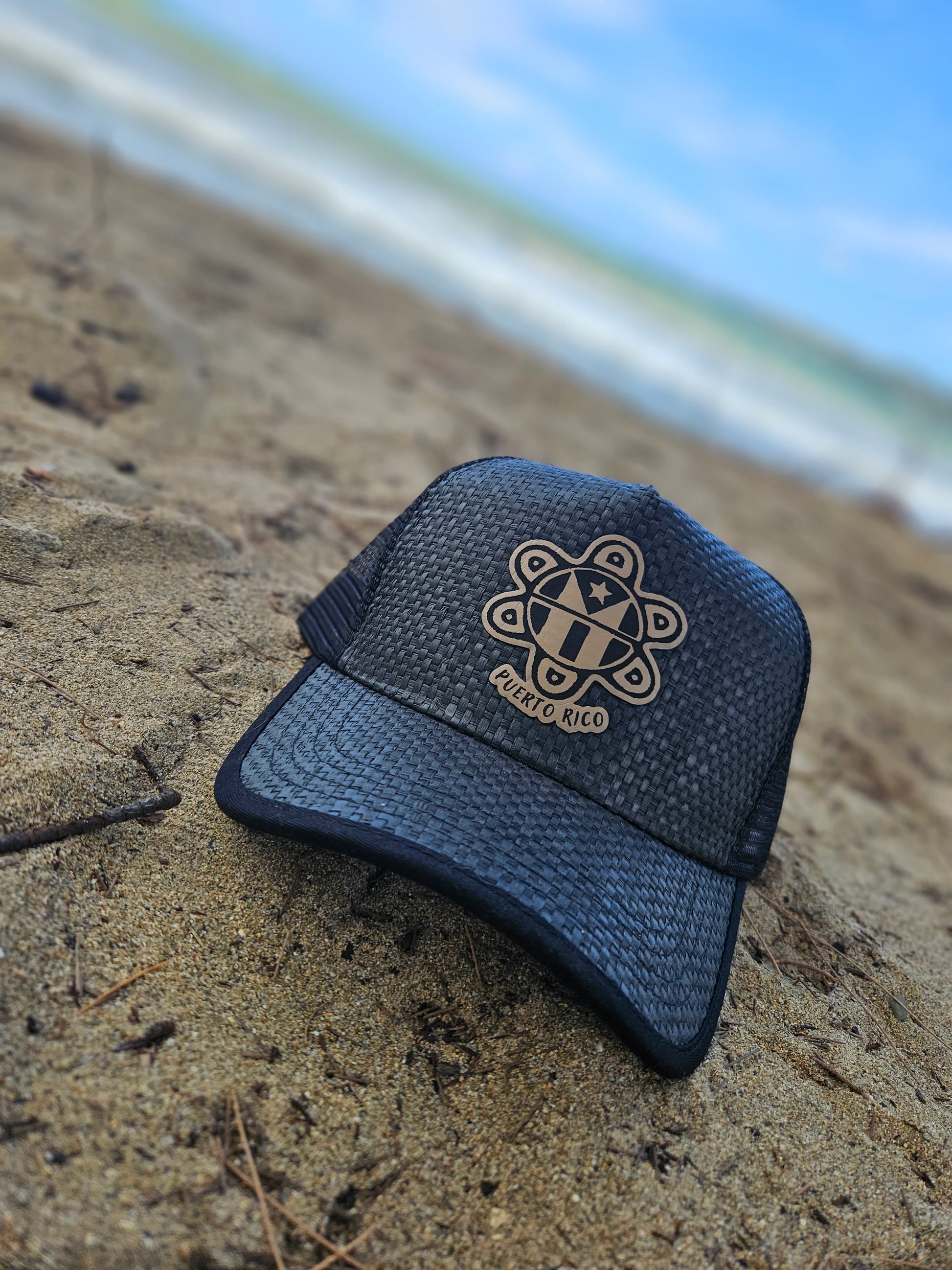 Gorra de paja negra con malla trasera negra. Ajustable. Abierta.