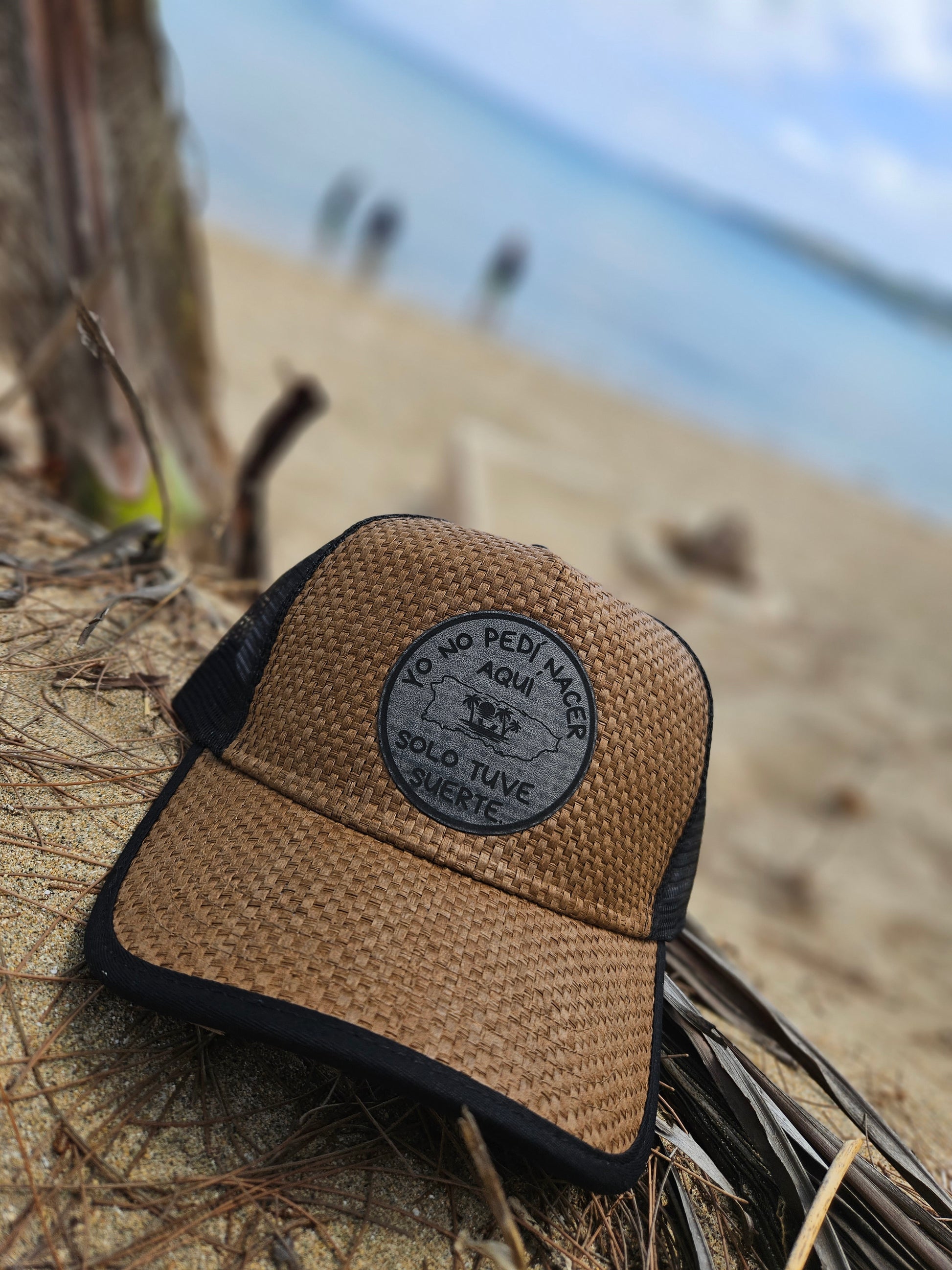 Gorra de paja marrón con malla trasera color negra. Ajustable. Abierta. High top.