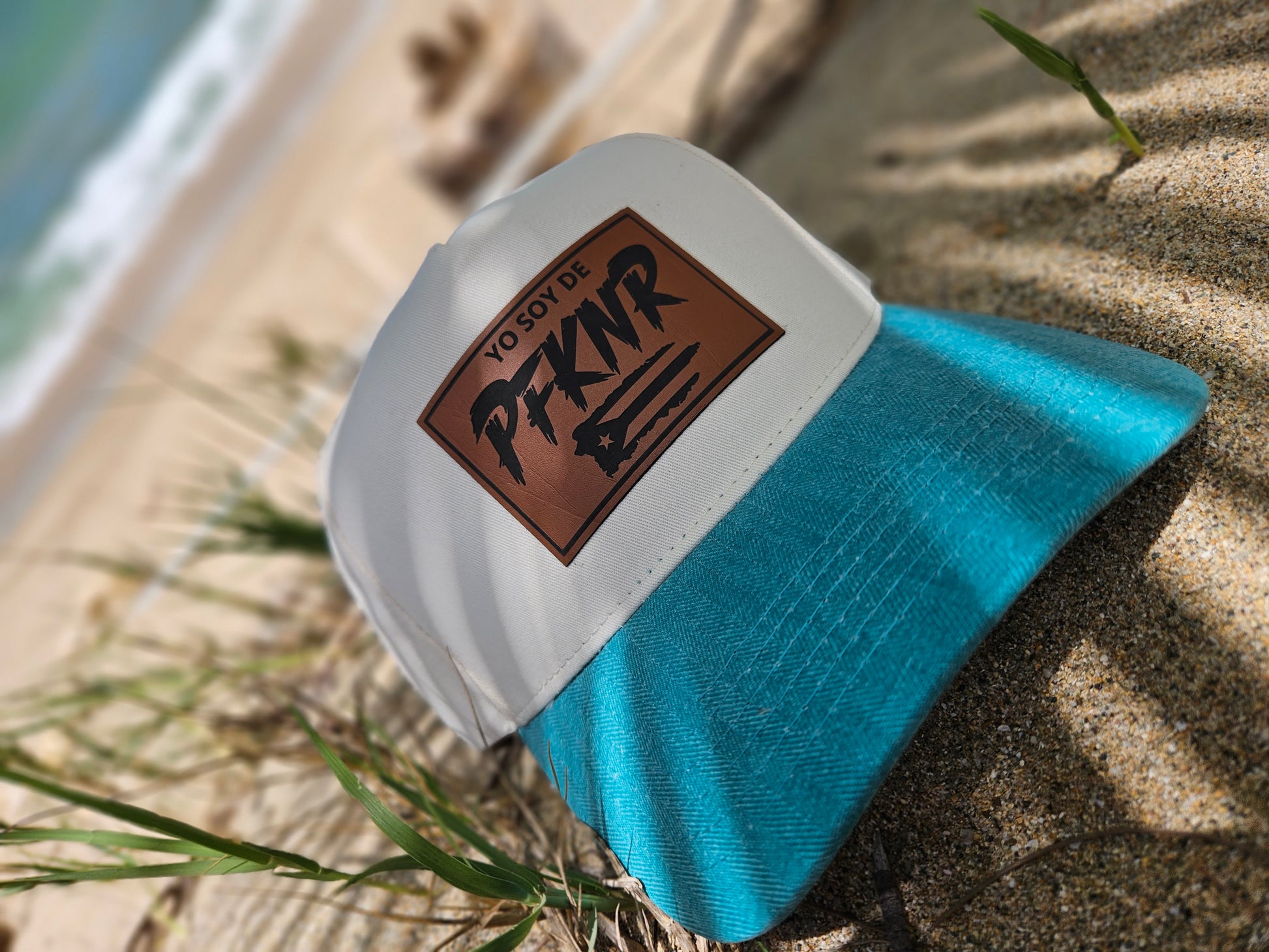 Gorra de tela crema con visera azul simulando mezclilla. Ajustable. Abierta. High top.Â
