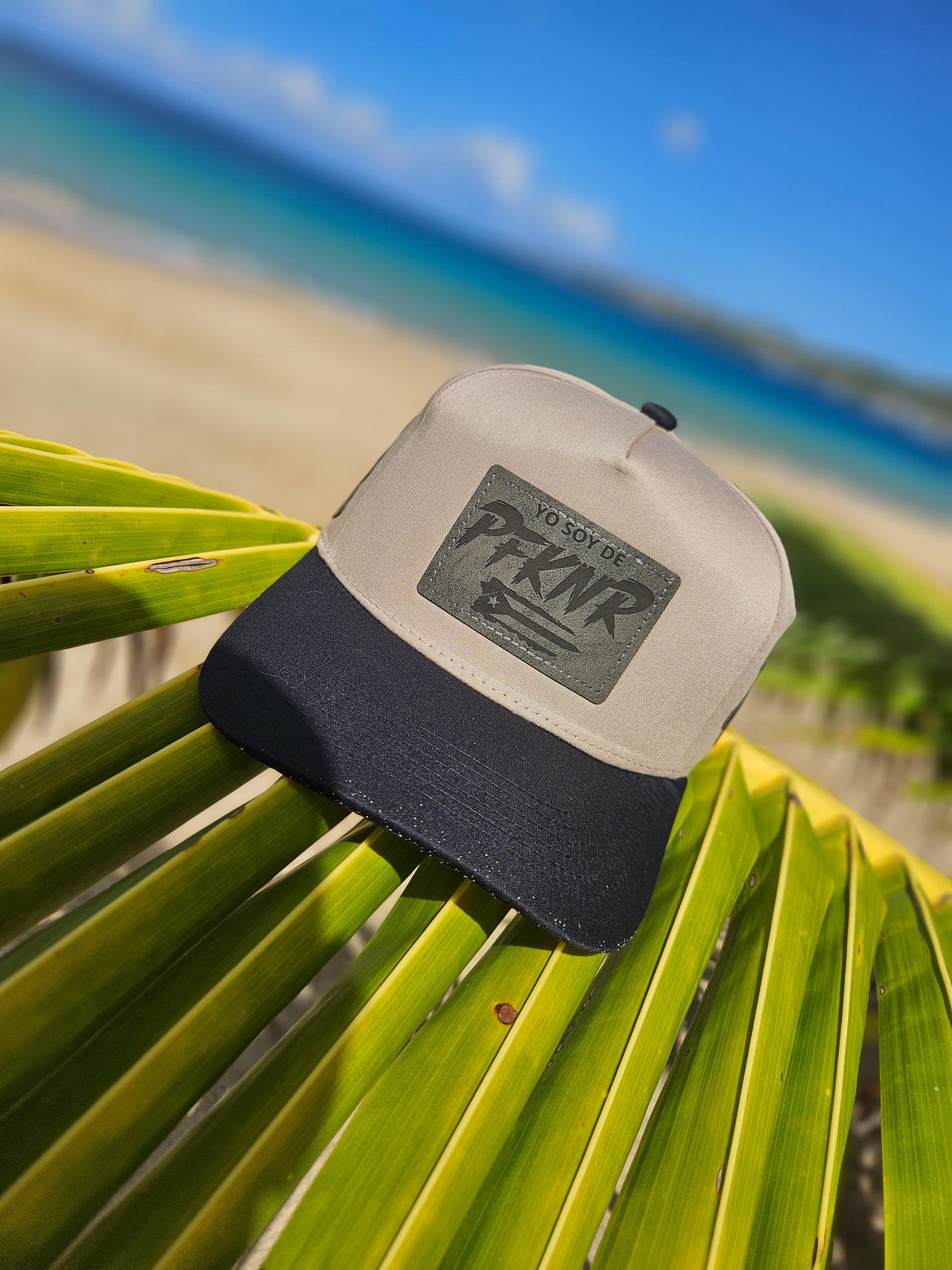 Gorra de tela crema con visera negra. Ajustable. Abierta. High top.